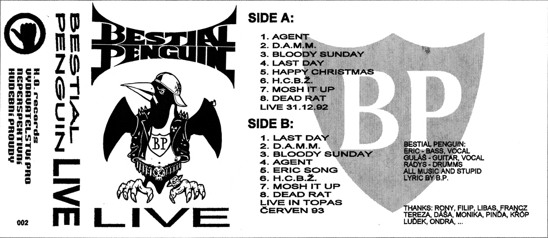 - basa, zpěv Guláš - kytara, zpěv Radys - bicí Strana A - nahráno na silvestrovském koncertě Bestial Penguin a T.N.P.B. u Franty ve sklepě 31.12.1992 Strana B - nahráno na koncertě Bestial Penguin v klubu Topas 13.6.1993 booklet - Eric logo a obrázek tučňáka - Filip a Eric K.O. records 1993